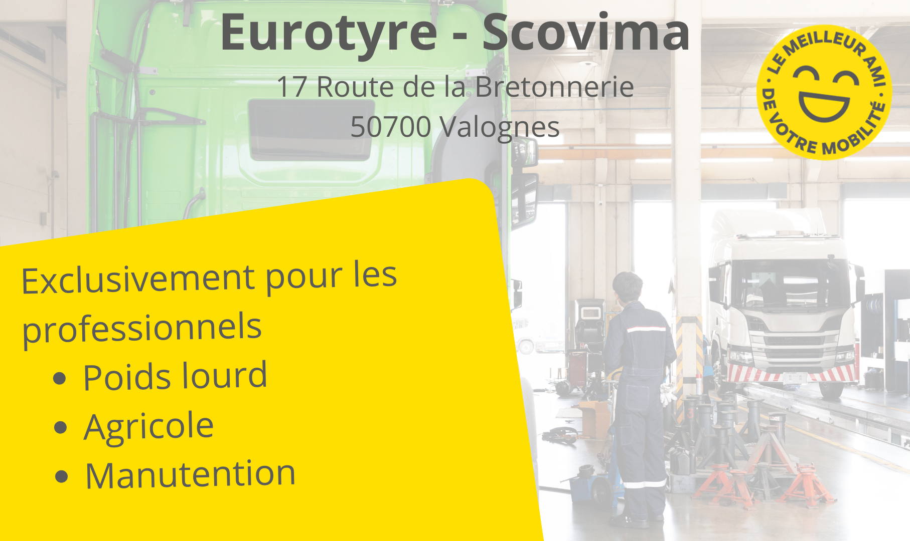 Toute l’équipe de notre garage Eurotyre SCOVIMA à 50700 VALOGNES accompagne exclusivement les professionnels pour l’entretien et l’équipement pneumatique de leurs véhicules industriels, tels que les poids lourds et les engins agricoles. Destiné uniquement aux clients professionnels, notre service propose une gamme complète de prestations dédiées à ces véhicules, ainsi que des outils en ligne comme la prise de rendez-vous. Aucun service n’est proposé aux particuliers.